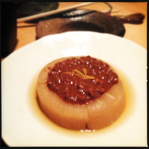 | Poached daikon with red miso and pork |